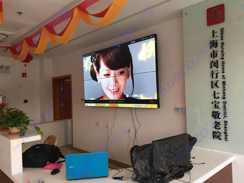 根據上海閔行區七寶敬老院的實際情況, 本來按效果來說應該安裝液壓前維護支架式,但是由于一些原因,只能安裝成了壁掛,這也是一大瑕疵。但是這款2X2的壁掛液晶拼接系統也為上海閔行區七寶敬老院的所有工作人員促進了工作效率,從節能、顯示方式、超高的清晰度等眾多優勢,無一不彰顯出液晶拼接屏的獨特魅力。