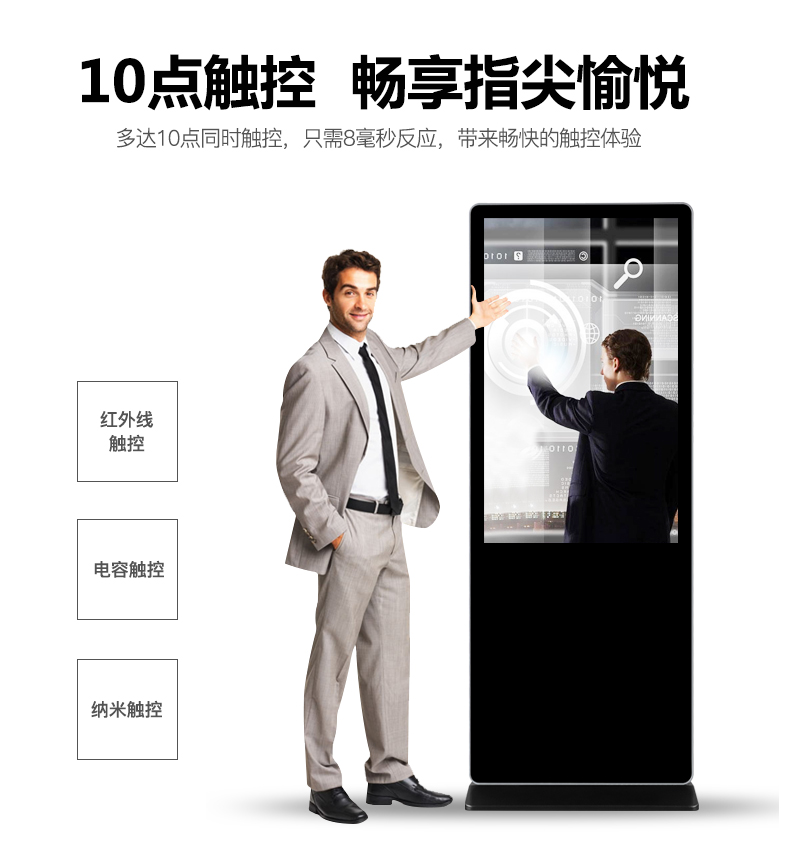 然而,目前市面上也涌現了非常多的液晶廣告機生產廠家,雖然各廠家的技術都差不多,最終拼的就是研發實力及售后響應速度,這樣液晶廣告機生產廠家才能給客戶帶來價值,為自己創造出更大的優越感。能夠實現觸摸的產品,比播放式數字標牌更能吸引消費者的主動參與。在未來數字標牌的發展中,虛擬現實已成為數字標牌新的發展趨勢,在行業的競爭中,能夠實現與客戶的更多的信息交互將是提高競爭力的有力因素,在這種競爭中,觸摸液晶廣告機體感將作為過渡將給客戶一個全新的體驗。