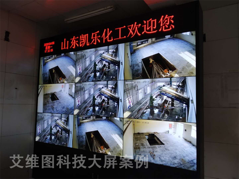 本次高清液晶大屏幕拼接屏監控系統建設,共包含9臺49寸LG拼接屏、1臺??低暯獯a矩陣、9單元落地機柜電視墻、1套3人位操作臺、1套P3.75單色LED顯示屏,9套高清信號線材等從,分別用在山東省棗莊市凱樂化工有限公司高清視頻監控室。