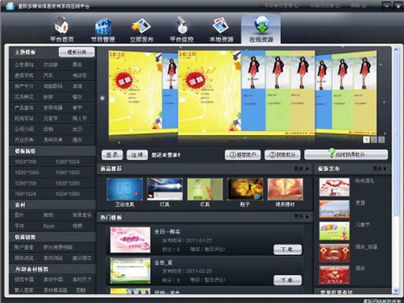 支持視頻、圖片、文字、滾動字幕、及時數據等多種素材顯示,支持全屏與分屏顯示節目,支持多臺機器同步播放,超震撼視覺效果